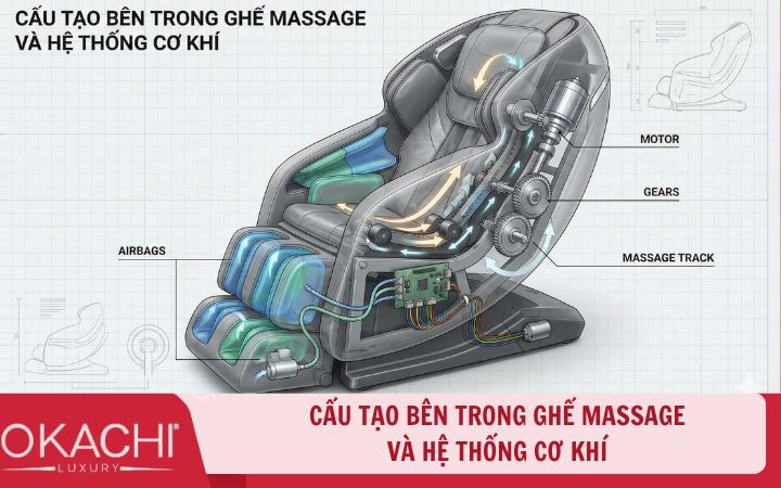 Đây là phần "lõi" quan trọng nhất, quyết định 80% giá thành và hiệu quả trị liệu của sản phẩm. Cấu tạo bên trong ghế massage là một tổ hợp phức tạp của cơ khí chính xác, điện tử và công nghệ AI.