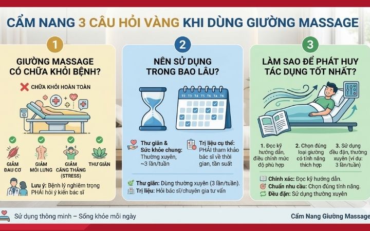 Sau khi đã hiểu rõ về loại giường hỗ trợ trị liệu này, cùng chúng tôi giải đáp một số câu hỏi thường gặp trong quá trình sử dụng giường nằm mát xa liên quan đến việc: có trị khỏi bệnh không, nên dùng trong bao lâu hay dùng như thế nào để phát huy tác dụng.