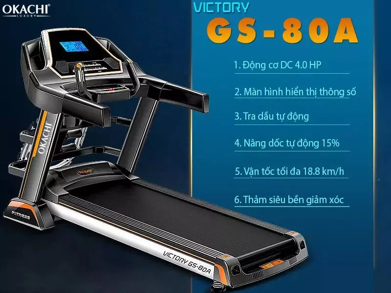Máy chạy bộ cao cấp chính hãng, đa năng CALIFIT VICTORY GS-80A có thiết kế vô cùng mạnh mẽ, năng động. Chạy bộ mỗi ngày không chỉ giúp cho cơ thể săn chắc mà còn giúp tinh thần sảng khoái, sáng suốt. Máy chạy bộ đa năng CALIFIT VICTORY GS-80A được trang những bài tập đa dạng. Động cơ của máy chạy bộ đa năng CALIFIT VICTORY GS-80A bền bỉ, công nghệ tiên tiến. Đặc biệt Máy chạy bộ đa năng CALIFIT VICTORY GS-80A còn được trang bị chức năng giảm sốc. Chiều rộng thoải mái giúp cho người sử dụng có không gian để tập luyện. Độ dốc của máy chạy bộ đa năng CALIFIT VICTORY GS-80A có thể điều chỉnh một cách nhanh chóng, dễ dàng. Ngoài ra, thiết bị còn được sử dụng màn hình điều khiển với các nút bấm, thời gian, nghe nhạc,...