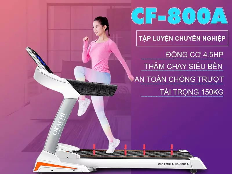 Máy chạy bộ Nhật Bản đa năng CALIFT VICTORIA CF-800A với thiết kế vô cùng hiện đại với rất nhiều bài tập dành cho bạn và gia đình cùng nhau luyện tập thể thao tại nhà. Máy chạy bộ cao cấp, đa năng CALIFT VICTORIA CF-800A với thiết kế rất chắc chắn, màu sắc tươi sáng, thiết kế tối giản dễ dàng mang đi mọi nơi mang vẻ đẹp vô cùng hiện đại, dễ dàng trong việc vệ sinh lau chùi. Các bài tập phù hợp với người sử dụng tùy theo nhu cầu tập luyện. Máy còn có màn hình TFT dễ dàng thao tác với nhiều chức năng, theo dõi nhịp tim, thời gian tập,... Máy chạy bộ đa năng CALIFIT VICTORIA CR-800A có động cơ được sản xuất theo công nghệ tiên tiến của Mỹ không có tình trạng rung hay có tiếng ồn. Việc điều chỉnh độ dốc tự động, thảm chạy rộng khiến cho người sử dụng thoải mái.