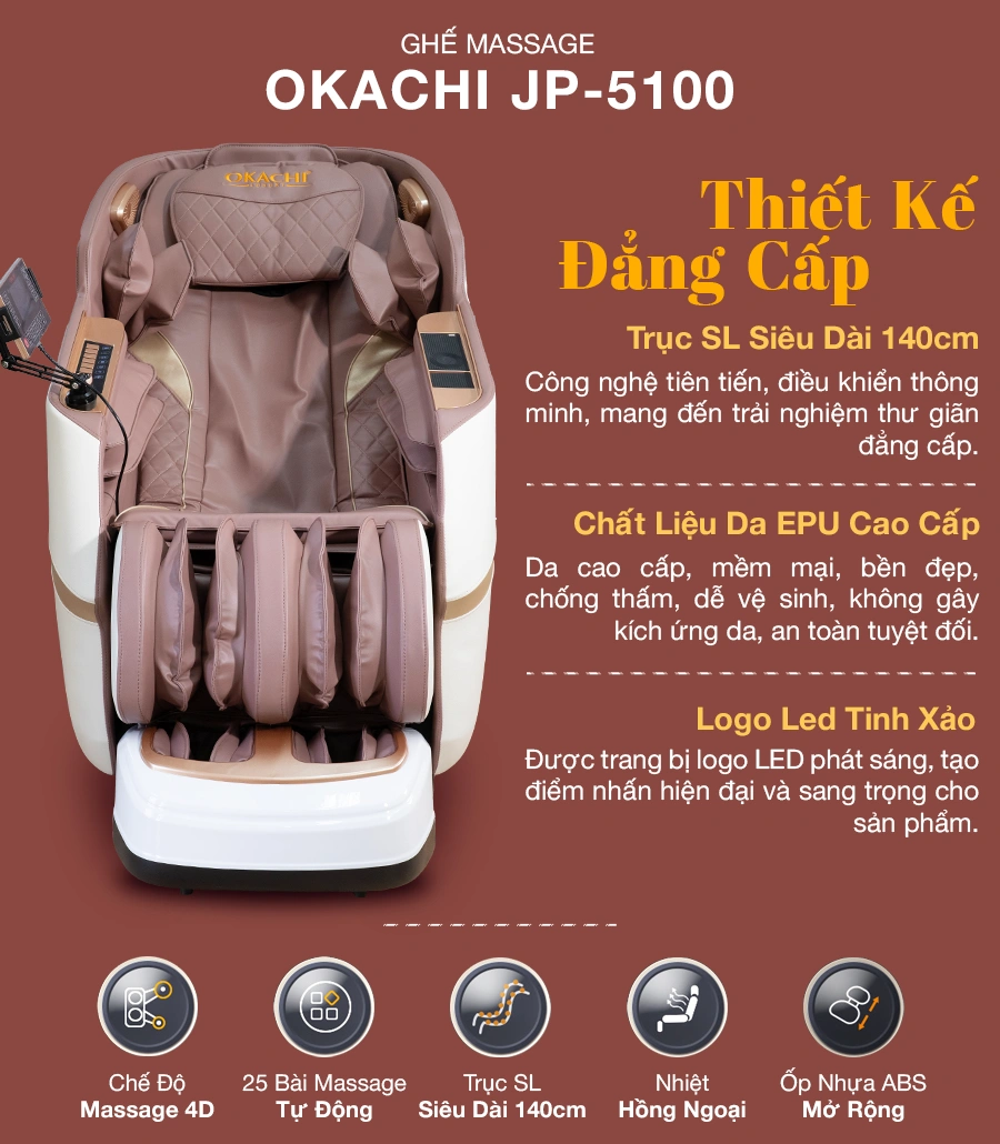 Ghế massage OKACHI JP-5100 có kiểu dáng rộng rãi, ôm trọn cơ thể, phù hợp với nhiều đối tượng. Da ghế sử dụng chất liệu EPU cao cấp 100%, mềm mại, thoáng khí và bền bỉ. Sự kết hợp màu sắc thời thượng trắng – nâu tím cùng đèn LED logo sang trọng giúp không gian sống trở nên đẳng cấp hơn.