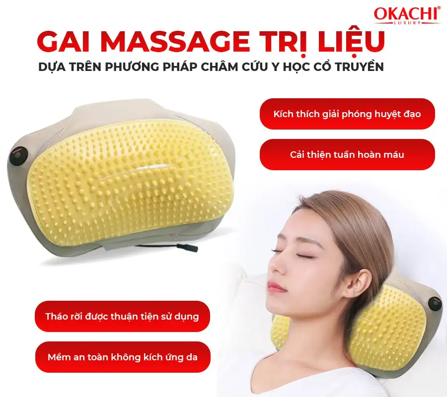 Gối được thiết kế một lớp gai massage châm cứu có thể tháo rời. Dựa trên phương pháp châm cứu cổ truyền, kích thích các huyệt đạo giải phóng đau nhức nhanh chóng và giúp tuần hoàn máu lưu thông tốt hơn.