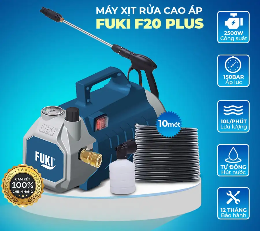 Máy xịt rửa xe cao áp Fuki F20 Plus 2500W (điều chỉnh áp) hiện đang là sản phẩm được nhiều người săn đón. Sở hữu những tính năng vượt trội cùng hàng loạt tiện ích đi kèm, giúp người dùng tiết kiệm thời gian, công sức và cả tiền bạc hiệu quả.